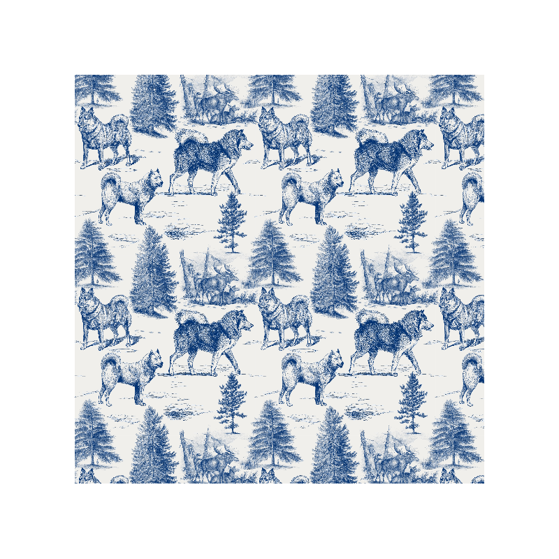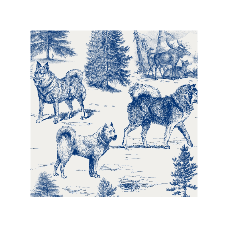 Wzór 44757 | Psy Szpice Północne w Zimowym Krajobrazie z Łosiami - Wzór Toile - Niebieskie na szarym Tle